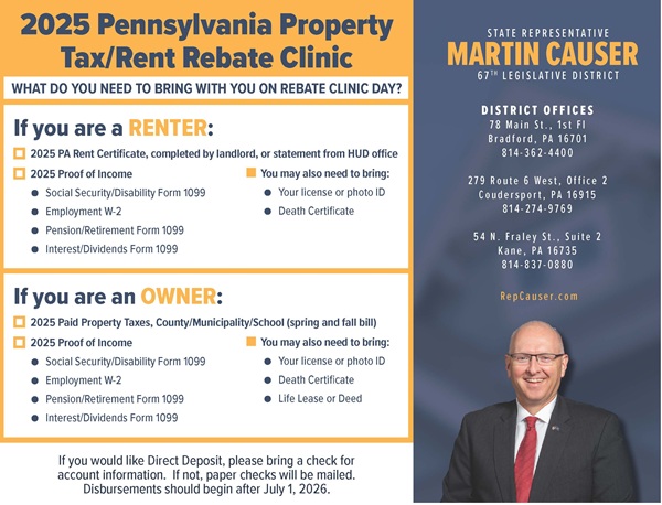 Need assistance filing for your 2025 Property Tax/Rent Rebate from the Commonwealth? Stop by one of our upcoming Property Tax/Rent Rebate clinics at locations across the 67th Legislative District. Assistance is provided FREE OF CHARGE during the clinics or any time at my offices in Bradford, Coudersport or Kane.