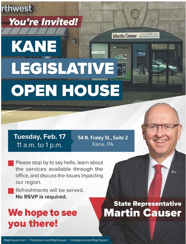 | • | Kane Senior Center, 100 N. Fraley St., Kane: Thursday, Feb. 19, 1-3 p.m. |